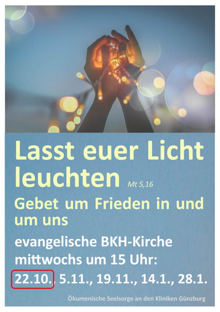 In der Kapelle des Kreiskrankenhauses und in den beiden Kirchen des Bezirkskrankenhauses feiern wir regelmäßig Gottesdienste, zu denen sowohl Patientinnen und Patienten, deren Angehörige, Mitarbeitende, als auch Personen von außerhalb der Kliniken eingeladen sind. Die aktuellen Gottesdienstzeiten in beiden Kliniken finden Sie hier.